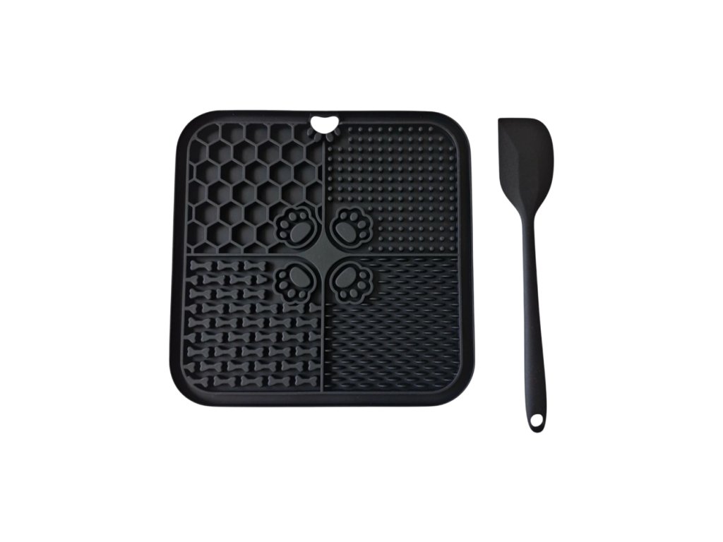 Díky čtvercovému tvaru s bočními okraji nedochází k přetékání potravy a pes zůstává soustředěný na pamlsek. Přísavky na spodní straně zajišťují stabilitu. Podložka se snadno udržuje – stačí ji opláchnout nebo vložit do myčky.